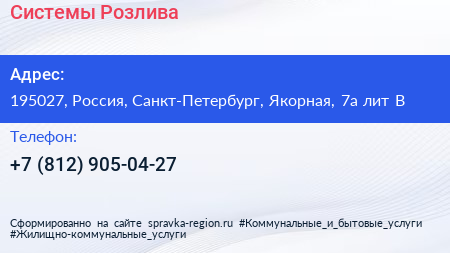 Системы Розлива по адресу 195027, Россия, Санкт-Петербург, Якорная, 7а лит В в дальнейшем Организация, размещена в следующих категориях: