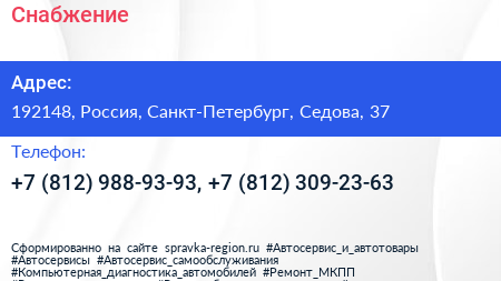 Для связи с организацией воспользуйтесь номером телефона: +7 (812) 988-93-93, +7 (812) 309-23-63. Пн: c 10:00-17:00, Вт: c 10:00-17:00, Ср: c 10:00-17:00, Чт: c 10:00-17:00, Пт: c 10:00-17:00, Сб: выходной, Вс: выходной. по предварительному звонку: пн-пт, вы можете обратиться в эту организацию.