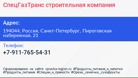 СпецГазТранс, строительная компания по адресу 194044, Россия, Санкт-Петербург, Пироговская набережная, 21 в дальнейшем Организация, размещена в следующих категориях: