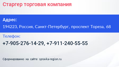 Старгер, торговая компания по адресу 194223, Россия, Санкт-Петербург, проспект Тореза, 68 в дальнейшем Организация, размещена в следующих категориях: