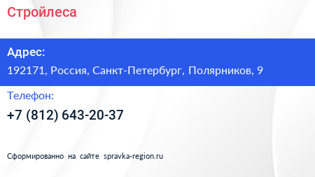 Стройлеса по адресу 192171, Россия, Санкт-Петербург, Полярников, 9 в дальнейшем Организация, размещена в следующих категориях: