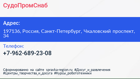 СудоПромСнаб по адресу 197136, Россия, Санкт-Петербург, Чкаловский проспект, 34 в дальнейшем Организация, размещена в следующих категориях: