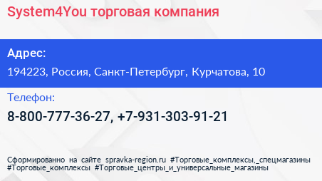 System4You, торговая компания по адресу 194223, Россия, Санкт-Петербург, Курчатова, 10 в дальнейшем Организация, размещена в следующих категориях: