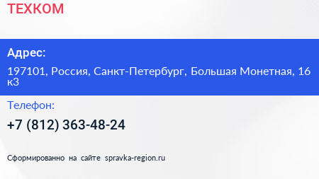 ТЕХКОМ по адресу 197101, Россия, Санкт-Петербург, Большая Монетная, 16 к3 в дальнейшем Организация, размещена в следующих категориях: