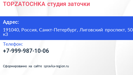 TOPZATOCHKA, студия заточки по адресу 191040, Россия, Санкт-Петербург, Лиговский проспект, 50 к3 в дальнейшем Организация, размещена в следующих категориях:
