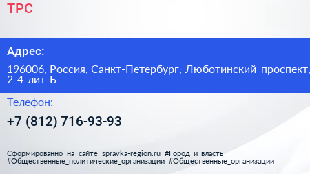 ТРС по адресу 196006, Россия, Санкт-Петербург, Люботинский проспект, 2-4 лит Б в дальнейшем Организация, размещена в следующих категориях: