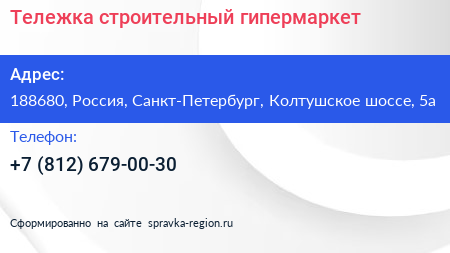 Тележка, строительный гипермаркет по адресу 188680, Россия, Санкт-Петербург, Колтушское шоссе, 5а в дальнейшем Организация, размещена в следующих категориях: