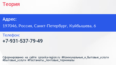 Теория по адресу 197046, Россия, Санкт-Петербург, Куйбышева, 6 в дальнейшем Организация, размещена в следующих категориях: