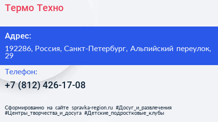 Термо Техно по адресу 192286, Россия, Санкт-Петербург, Альпийский переулок, 29 в дальнейшем Организация, размещена в следующих категориях: