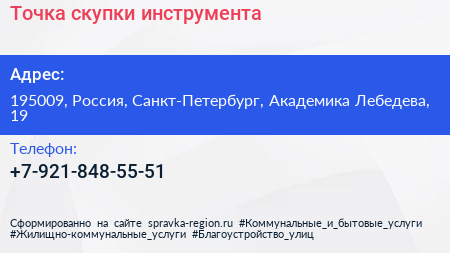 Точка скупки инструмента по адресу 195009, Россия, Санкт-Петербург, Академика Лебедева, 19 в дальнейшем Организация, размещена в следующих категориях: