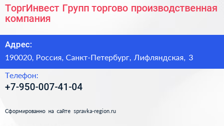 ТоргИнвест Групп, торгово-производственная компания по адресу 190020, Россия, Санкт-Петербург, Лифляндская, 3 в дальнейшем Организация, размещена в следующих категориях: