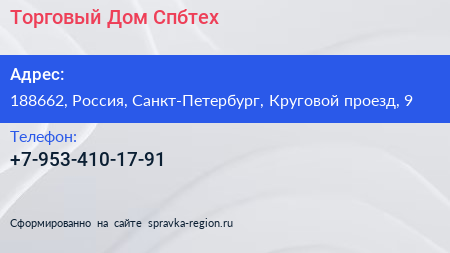 Торговый Дом Спбтех по адресу 188662, Россия, Санкт-Петербург, Круговой проезд, 9 в дальнейшем Организация, размещена в следующих категориях:
