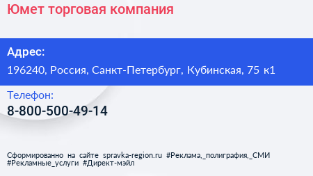 Юмет, торговая компания по адресу 196240, Россия, Санкт-Петербург, Кубинская, 75 к1 в дальнейшем Организация, размещена в следующих категориях: