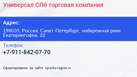 Универсал СПб, торговая компания по адресу 198035, Россия, Санкт-Петербург, набережная реки Екатерингофки, 22 в дальнейшем Организация, размещена в следующих категориях: