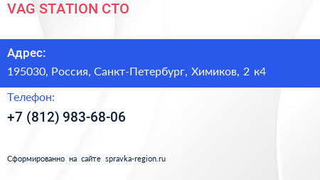 VAG STATION, СТО по адресу 195030, Россия, Санкт-Петербург, Химиков, 2 к4 в дальнейшем Организация, размещена в следующих категориях: