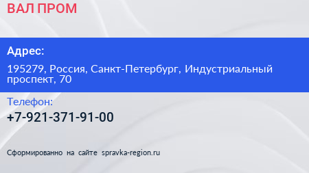 ВАЛ-ПРОМ по адресу 195279, Россия, Санкт-Петербург, Индустриальный проспект, 70 в дальнейшем Организация, размещена в следующих категориях: