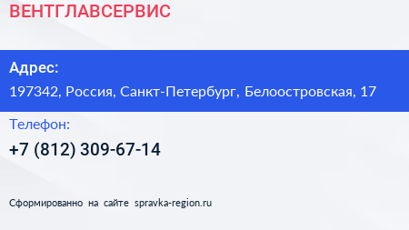 ВЕНТГЛАВСЕРВИС по адресу 197342, Россия, Санкт-Петербург, Белоостровская, 17 в дальнейшем Организация, размещена в следующих категориях: