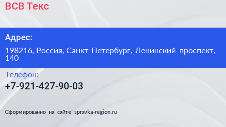 ВСВ Текс по адресу 198216, Россия, Санкт-Петербург, Ленинский проспект, 140 в дальнейшем Организация, размещена в следующих категориях: