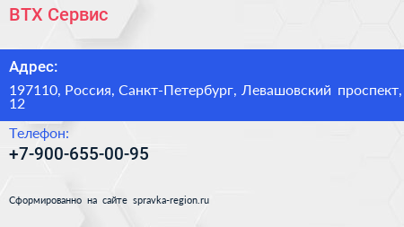 ВТХ-Сервис по адресу 197110, Россия, Санкт-Петербург, Левашовский проспект, 12 в дальнейшем Организация, размещена в следующих категориях: