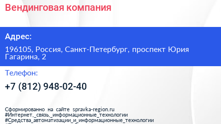 Вендинговая компания по адресу 196105, Россия, Санкт-Петербург, проспект Юрия Гагарина, 2 в дальнейшем Организация, размещена в следующих категориях: