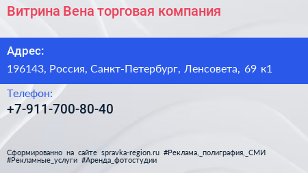 Витрина Вена, торговая компания по адресу 196143, Россия, Санкт-Петербург, Ленсовета, 69 к1 в дальнейшем Организация, размещена в следующих категориях: