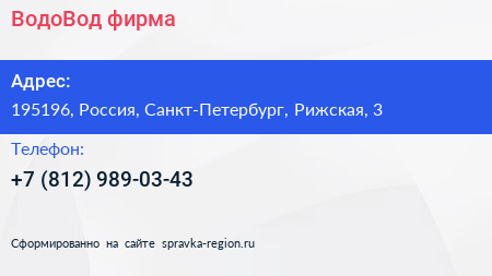 ВодоВод, фирма по адресу 195196, Россия, Санкт-Петербург, Рижская, 3 в дальнейшем Организация, размещена в следующих категориях: