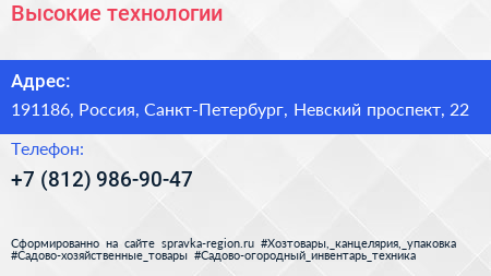 Высокие технологии по адресу 191186, Россия, Санкт-Петербург, Невский проспект, 22 в дальнейшем Организация, размещена в следующих категориях:
