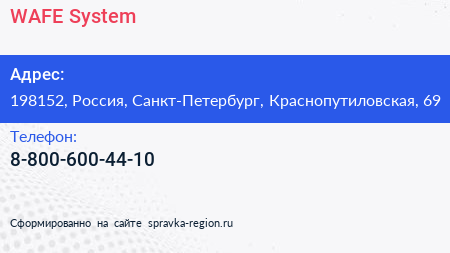 WAFE-System по адресу 198152, Россия, Санкт-Петербург, Краснопутиловская, 69 в дальнейшем Организация, размещена в следующих категориях: