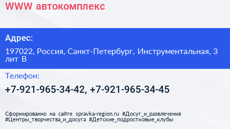 WWW, автокомплекс по адресу 197022, Россия, Санкт-Петербург, Инструментальная, 3 лит В в дальнейшем Организация, размещена в следующих категориях:
