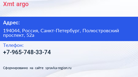 Xmt-argo по адресу 194044, Россия, Санкт-Петербург, Полюстровский проспект, 52а в дальнейшем Организация, размещена в следующих категориях: