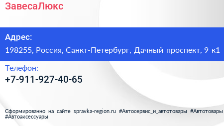 ЗавесаЛюкс по адресу 198255, Россия, Санкт-Петербург, Дачный проспект, 9 к1 в дальнейшем Организация, размещена в следующих категориях: