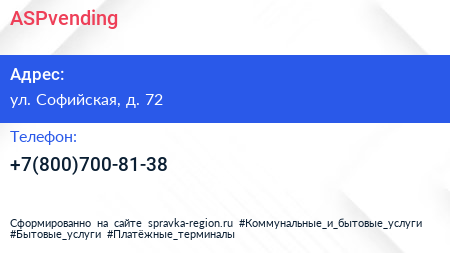 ASPvending по адресу ул. Софийская, д. 72 в дальнейшем Организация, размещена в следующих категориях: