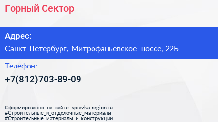 Горный Сектор по адресу Санкт-Петербург, Митрофаньевское шоссе, 22Б в дальнейшем Организация, размещена в следующих категориях: