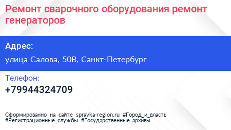 Ремонт сварочного оборудования, ремонт генераторов по адресу улица Салова, 50В, Санкт-Петербург в дальнейшем Организация, размещена в следующих категориях: