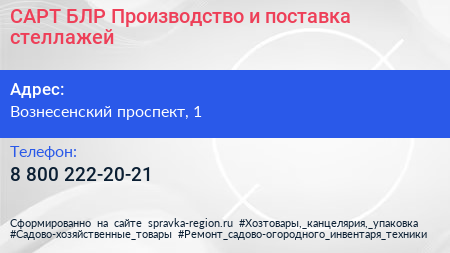 САРТ БЛР - Производство и поставка стеллажей по адресу Вознесенский проспект, 1 в дальнейшем Организация, размещена в следующих категориях:
