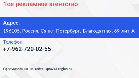 1-ое рекламное агентство по адресу 196105, Россия, Санкт-Петербург, Благодатная, 69 лит А в дальнейшем Организация, размещена в следующих категориях: