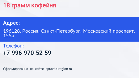 18 грамм, кофейня по адресу 196128, Россия, Санкт-Петербург, Московский проспект, 155а в дальнейшем Организация, размещена в следующих категориях: