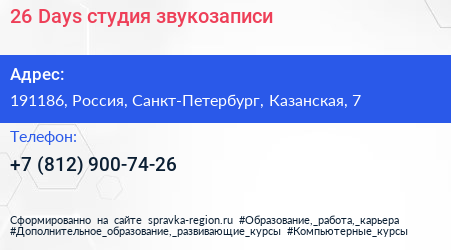 26 Days, студия звукозаписи по адресу 191186, Россия, Санкт-Петербург, Казанская, 7 в дальнейшем Организация, размещена в следующих категориях: