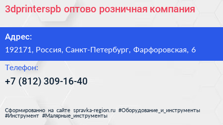 3dprinterspb, оптово-розничная компания по адресу 192171, Россия, Санкт-Петербург, Фарфоровская, 6 в дальнейшем Организация, размещена в следующих категориях: