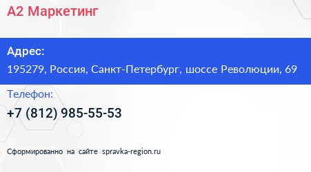А2 Маркетинг по адресу 195279, Россия, Санкт-Петербург, шоссе Революции, 69 в дальнейшем Организация, размещена в следующих категориях: