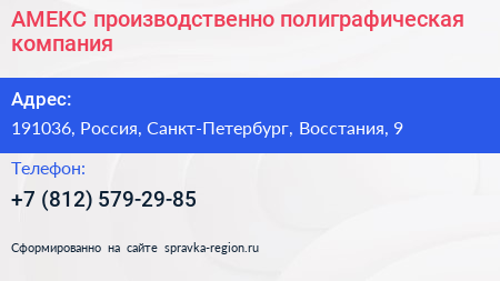 АМЕКС, производственно-полиграфическая компания по адресу 191036, Россия, Санкт-Петербург, Восстания, 9 в дальнейшем Организация, размещена в следующих категориях: