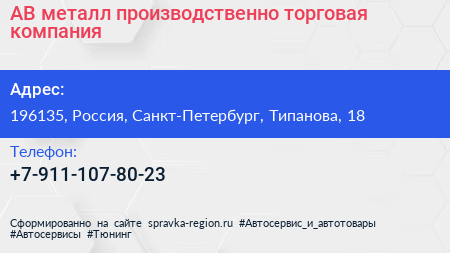 АВ-металл, производственно-торговая компания по адресу 196135, Россия, Санкт-Петербург, Типанова, 18 в дальнейшем Организация, размещена в следующих категориях: