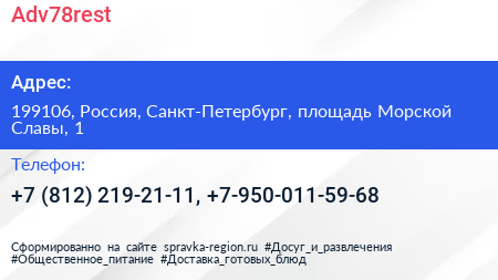 Adv78rest по адресу 199106, Россия, Санкт-Петербург, площадь Морской Славы, 1 в дальнейшем Организация, размещена в следующих категориях: