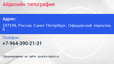 Айдизайн, типография по адресу 197198, Россия, Санкт-Петербург, Офицерский переулок, 8 в дальнейшем Организация, размещена в следующих категориях:
