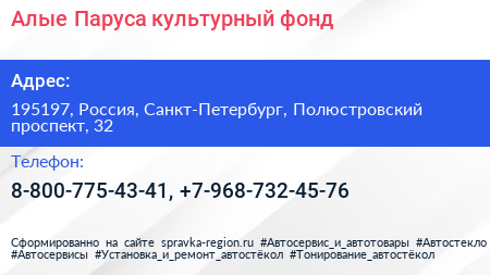 Алые Паруса, культурный фонд по адресу 195197, Россия, Санкт-Петербург, Полюстровский проспект, 32 в дальнейшем Организация, размещена в следующих категориях: