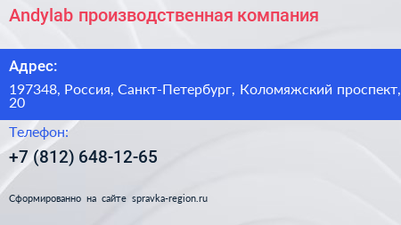 Andylab, производственная компания по адресу 197348, Россия, Санкт-Петербург, Коломяжский проспект, 20 в дальнейшем Организация, размещена в следующих категориях: