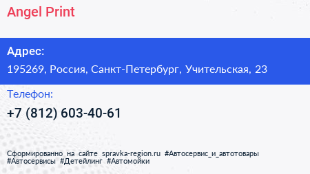 Angel Print по адресу 195269, Россия, Санкт-Петербург, Учительская, 23 в дальнейшем Организация, размещена в следующих категориях: