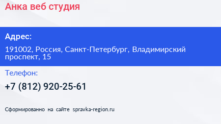 Анка, веб-студия по адресу 191002, Россия, Санкт-Петербург, Владимирский проспект, 15 в дальнейшем Организация, размещена в следующих категориях: