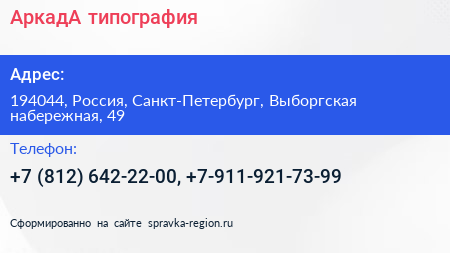 АркадА, типография по адресу 194044, Россия, Санкт-Петербург, Выборгская набережная, 49 в дальнейшем Организация, размещена в следующих категориях: