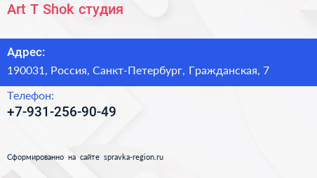 Art-T-Shok, студия по адресу 190031, Россия, Санкт-Петербург, Гражданская, 7 в дальнейшем Организация, размещена в следующих категориях: